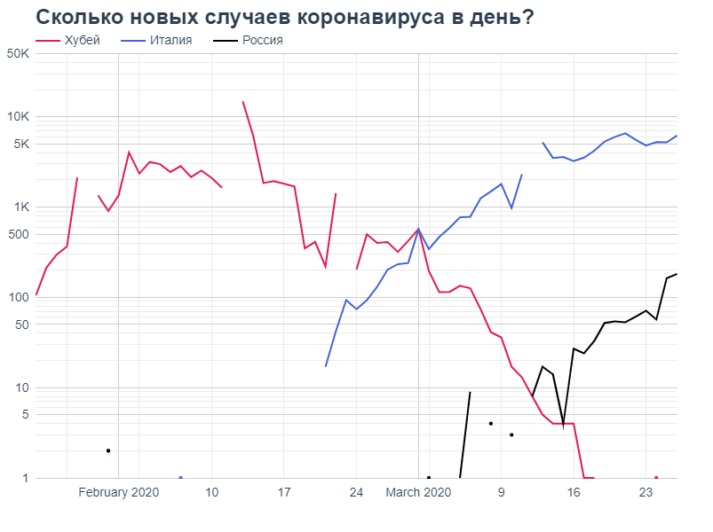 Россия сегодня перевалила за 1000 выявленных случаев, и само по себе это число ничего не значит. Чтобы понять, на какой стадии сейчас эпидемия, надо смотреть на динамику новых положительных диагнозов. По сравнению с провинцией Хубей, где эпидемию вроде как забороли, и Италией, где эпидемия суровей всех, но, кажется, ситуация стабилизировалась. Видно, что у нас (черная линия) эпидемия только началось. Следует ожидать роста как минимум до уровня красной и синей линии (при том, что в Италии и в провинции Хубей живет по 60 млн человек), если только вдруг не случится какого-то чуда. С какой скоростью будет расти наша линия, когда пойдет на спад — вот и весь вопрос. Не пугайтесь, когда услышите про 1000 зараженных в день, такая, к сожалению, болезнь. Всё будет хорошо! Главное не ездите никуда в выходную неделю и как можно реже выходите из дома. График автоматически обновляется каждый день по этой ссылке.
