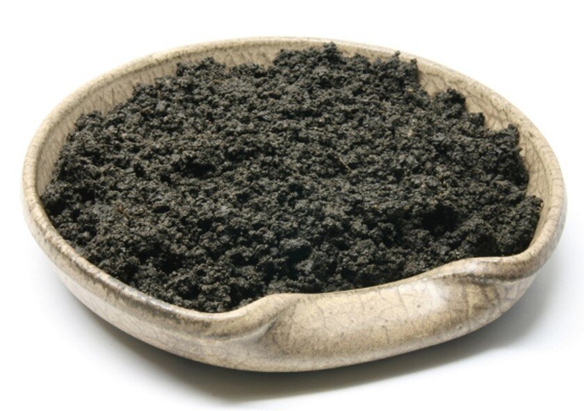 В естественных условиях данное средство встречается в виде порошка темного цвета (от серого до насыщенно черного). Его уникальные свойства объясняются наличием микроэлементов: кальция, магния, углерода, железа, кварца, стронция. Благодаря такому составу черная глина обладает следующим свойствами: