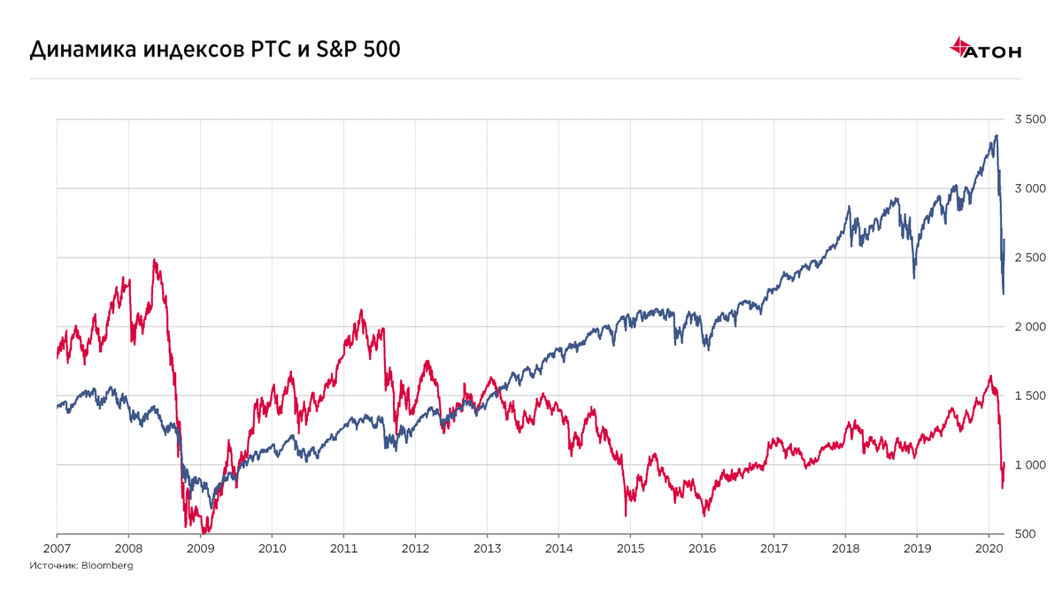 На фоне распространения коронавируса в мире индекс РТС упал со своего пика в январе на 50% до 830 пунктов к концу марта. Падение стало самым быстрым за всю его историю, но пока не самым глубоким (в кризис 2008 г. индекс РТС просел на 80% до 500 пунктов). Российская экономика находится в лучшей форме, чем во время предыдущих кризисов 1998, 2008 и 2014 годов, а ее ВВП, возможно, продемонстрирует минимальный рост в 2020, в то время как мировая экономика стоит на пороге рецессии. Однако этот факт не защитит российский фондовый рынок, и его динамика будет зависеть от настроя глобальных рынков, в первую очередь, рынков США, и цен на нефть. Последние вряд ли имеют шанс вернуться к докризисному уровню выше $60/барр. до конца года, если не будет масштабного соглашения о сокращении добычи между крупнейшими производителями, включая США. Это будет оказывать давление на российские индексы, в которых большую долю (40%) занимает нефтяной сектор. Что касается зависимости российского рынка от американс