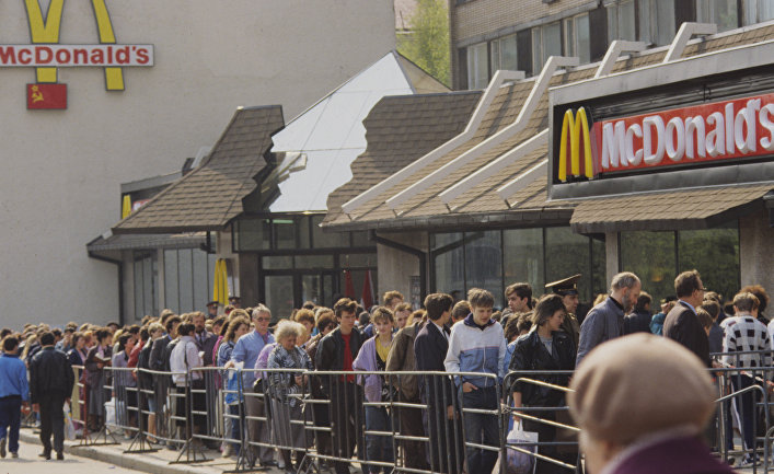 В Россию пришел гамбургер, миновав железный занавес. 31 января исполнится 30 лет с тех пор, как американский «Макдональдс» открыл ресторан в столице уже не существующего СССР. Воздействие, которое капиталистический фастфуд и сервис по обслуживанию клиентов оказали на коммунизм, до сих пор является предметом обсуждения. Вспомним о революционном выходе «Макдональдс» на советский рынок, а также о пути к завершению холодной войны. Когда начинаешь есть бургер, смешивается вкус котлеты и овощей. Первый ресторан «Макдональдс» открылся в Москве, столице СССР, а теперь — России, в 1990 году. С тех пор он стал местом отдыха горожан. Интерьер заведения оформлен под дерево. Сейчас можно сделать заказ при помощи сенсорного экрана. «Раньше приходилось час стоять в очереди, чтобы попасть внутрь. Еду выдавали практически сразу же после заказа. Я удивилась, насколько это было вкусно», — говорит Зоя (74 года), которая раньше работала в гостинице. Ей удалось попасть в «Макдональдс» через месяц после от