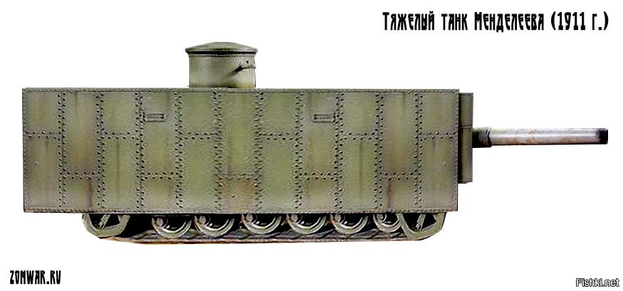 Краткие технические характеристики: вместимость - 8 человек; длина - одиннадцать метров; ширина корпуса - более 4 метров; высота 4,5 метра (при условии, что башня поднята); в танке использовалась морская пушка калибром в 120мм; двигатель четырехцилиндровый мощностью в 250 лс; пневматическая подвеска; скорость вдоль по автомагистрали — 24 км/ч; скорость танка по дороге без покрытия — 10 км/ч. Заключение Хотя в некоторых аспектах Танк Менделеева превосходил своими техническим характеристикам и новшествам аналогичные машины, но он был достаточно громоздким и большим. Не смотря детальную проработку своей идеи, которую вполне возможно было реализовать на судостроительных заводах, Танк Менделеева оказался ненужным проектом для царской России.