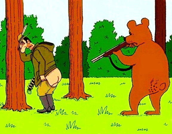 Идет русское застолье. За столом три бывалых охотника: двое помоложе, а один самый старый, очень крутой охотник, без ноги. Зовут его Сан Саныч. Его все просят: Сан Саныч, ну расскажи! Расскажи, как ты ногу то потерял? Ну, пожалуйста! Интересно… Он говорит: не, не, ребята. Это страшно. Ему говорят: ну расскажи! Он говорит: ну ладно, слухай сюды. Однажды шел я по лесу, охочусь, в кармане два бутыля самогона, в сумке ничего нет. Думаю, сейчас приду домой, а Люська моя заругает: ах ты гад! Нифига не поймал… Как вдруг смотрю – нора. Я туда ствол засунул и пульнул. Сунул руку, а там заяц. Ну… Выпил я 100 грамм с радости и запихнул его в сумку. Иду значит дальше. Смотрю – еще нора. Только в два раза больше. Стрельнул… а там лисица. Выпил, запихнул ее и пошел дальше. Смотрю – большущая такая дыра. Стрельнул и смотрю… Там медведь. Ну еще выпил, кое как его положил в сумку и дальше попер. Смотрю – еще нора. Только в 10 раз больше чем я сам. Как я все выпил, как стрельнул туда дуплетом… А она, он