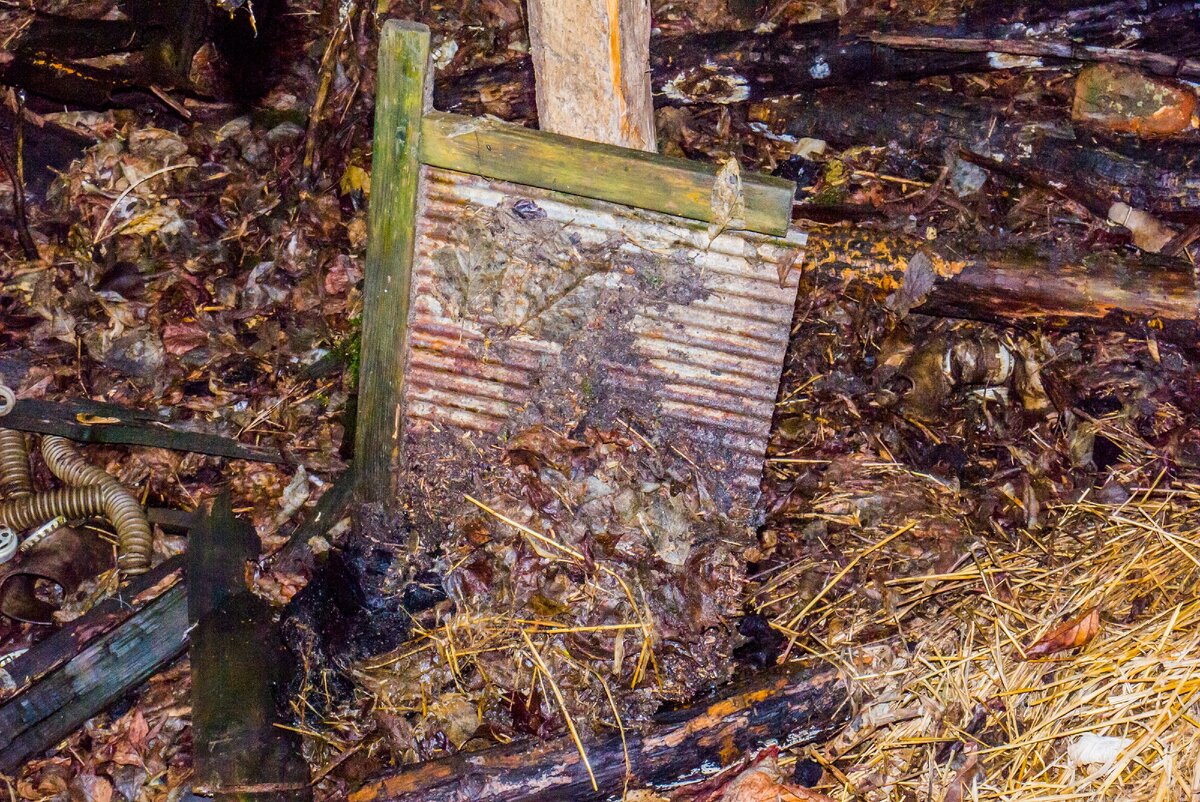 Продолжаю свой рассказ о заброшенном доме, в котором мы нашли много противогазов и о наших находках в нем из прошлого времени. Первую часть об этом доме вы можете прочитать по ссылке, которую я прикреплю в конце этой статьи. Рядом с кучей противогазов, которую я вам уже показывал в предыдущей статью, стояла, подпертая на деревянную перекладину, стиральная доска. Ну думаю, многие читатели старшего поколения помнят - эту штуку опускали в таз с водой и порошком и об нее начинали стирать белье. Также в комната стояла деревянная рама со стеклами, а на ней висела авоська с которыми в советское время ходили в магазин за хлебом. Полиэтиленовых пакетов в то время практически не было. В углу комнаты стоял стол, на котором лежали стеклянные бутылки и банки. За столом в стене когда-то было окно, но его впоследствии заложили кирпичом, и сейчас вместо него образовалась ниша, на котором тоже лежали банки с бутылками. Рядом со столом лежала куча кирпичей вперемешку с землей. Это, скорее всего, то, чт