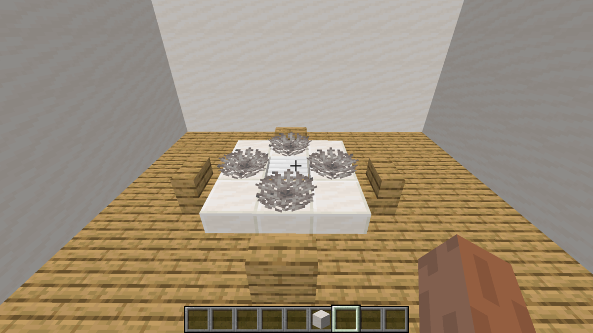 Для этой постройки надо 4 мёртвых коралловых-мозговика, 4 ступеньки, 1 стержень эндера, 8 полублоков, 1 железная нажимная плита. Ставим стержень эндера и на него ставим железную нажимную плиту. Окружаем эту конструкцию полублоками. И ставим мёртвые кораллы.