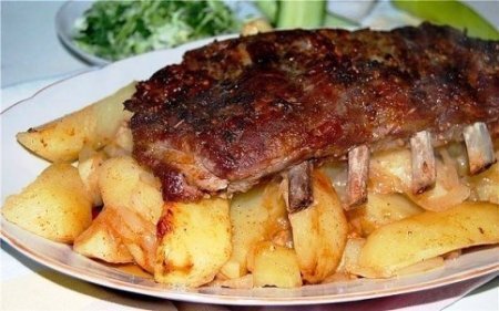 Шаг 3 В рукав для запекания кладем картофель, сверху на картофель промаринованные ребра, завязываем края рукава, выкладываем на противень и ставим в разогретую духовку до 200 градусов на 1 час, за минут за 10 до конца готовки разрезаем рукав и раскрываем.