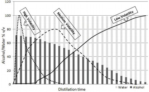 Хотя учитывая критерии, указанные выше, можно предсказать временной коридор, когда определенный летучий компонент будет испаряться и затем конденсироваться. На этом основана техника разделения дистиллята на фракции. На графике можно проследить общую зависимость испарения летучих компонентов в зависимости от пропорций этанола и воды в смеси.
