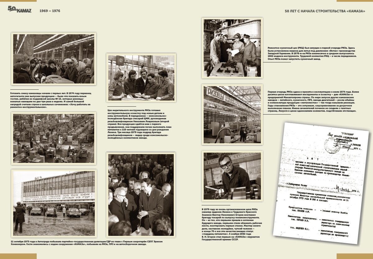 Рассказ о том, как строился РИЗ, Ремонтно-инструментальный завод «КАМАЗа», мы начали в материале РИЗ — первенец «КАМАЗа». Сегодня публикуем окончание этого рассказа. Готовить смену камазовцы начали с первых лет. В 1974 году первенец автогиганта уже выпускал продукцию – было что показать юным гостям, ребятам из подшефной школы № 13, которых ризовцы-вожатые навещали по два-три раза в неделю. И самой большой наградой считали строки в школьных сочинениях: «Хочу работать на ремонтно-инструментальном». Цех мерительного инструмента РИЗа готовил инструментальную оснастку под новые детали и узлы автомобиля. В передовиках – комсомольско- молодёжная бригада слесарей ЦМИ, руководимая резьбошлифовщиком Николаем Лощаковым (на фото — второй справа). Вся продукция сдаётся ими с первого предъявления, они поддержали почин выполнить план пятилетки к 110-летней годовщине со дня рождения Ленина. Три месяца 1979 года подряд бригада резьбошлифовщиков – лидер среди комсомольско-молодёжных коллективов завода.