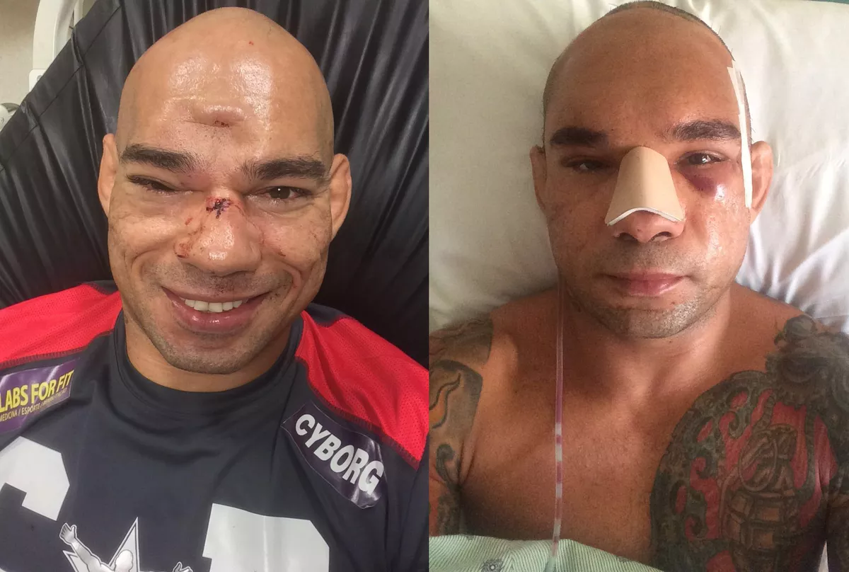 Никаких сомнений не вызывает тот факт, что ММА – это опасный вид спорта, который наносит большой урон человеческому телу, и ни один боец не остаётся невредимым после долгих лет выступлений в клетке. А некоторые бойцы так и вообще не имеют возможности решать, когда им уходить на покой. Вместо них решение об отставке принимает тяжёлая травма. В этой статье мы рассмотрим 10 таких случаев, когда ужасные травмы, а в некоторых случаях опасные для жизни заболевания, возникшие во время боёв, не оставили этим атлетам другого выбора, кроме как повесить на гвоздь свои перчатки. Эвангелиста Сантос Эвангелиста "Киборг" Сантос (экс-супруг Крис "Киборг") – ветеран этого вида спорта, имеющий за плечами четыре десятка боёв, дерясь в своё время в таких промоушенах как PRIDE, Strikeforce и Bellator. В последнем из них он и завершил свою карьеру. В июле 2016 года "Киборг" ступил в клетку против Майкла Пейджа – динамичного ударника, который считался восходящей звездой Bellator с идеальным рекордом 10-0