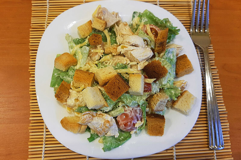Примерное КБЖУ на 100 грамм блюда: Б - 13,3 г; Ж - 8,4 г; У - 9,3 г; 169,2 Ккал. Ингредиенты: - куриное филе - 450 г; - хлеб - 200 г; - томаты черри - 250 г; - салат - 1 пучок; - твердый сыр - 100 г; - майонез - 100 г; - горчица - 1 ч ложка; - свежий чеснок - 2 зубчика; - сок лимона - 30 мл. Способ приготовления: Приготовление сухариков