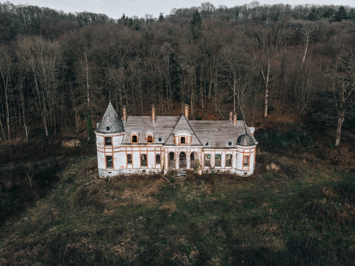Сейчас от этого французского особняка, кроме стен, ничего не осталось - поэтому уже сложно поверить, что когда-то он был прекрасен и богат, выстроенный на изысканный вкус хозяйки-парижанки и находящийся под заботливой рукой десятка слуг. Вместе с мужем они построили этот маленький дворец, окружённый большим парком с прудом с одной стороны, и лесом - с другой, в 1940-50х годах как дополнительную резиденцию, куда приезжали отдохнуть на выходные. Всё остальное время здесь хозяйничали смотритель и садовник, причем первый жил в небольшом домике около главных ворот, а второй периодически наведывался, чтобы приводить сад в порядок. Приезжая на выходных, пожилая пара любила неспешно прогуливаться под ручку в парке, отдыхая здесь от парижского шума и суеты. Приезжали они всегда с водителем на большой чёрной машине, которая, почему-то, так и осталась стоять припаркованной в гараже на территории парка, когда хозяев не стало.. А не стало их в 1964м году, и с тех пор для особняка начались не лучшие