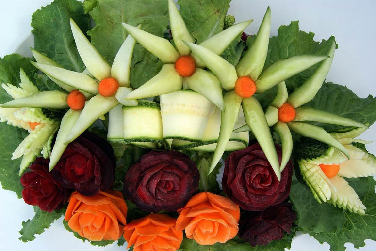 Сегодня я хочу Вам рассказать о необычном виде творчества, а именно о Карвинге. Карвинг происходит от английского слова - carving — «вырезание». Искусство Карвинга пришло из Юго-Восточной Азии. Согласно одной из легенд, на королевский фестиваль Лойкратхонг в царстве Сукхотаи примерно в 1240—1350 (по другим данным, в 1364 году) девушка по имени Nang Noppamar представила плавучую лампу. Лампа была не простая ее украшала фигурка птицы и цветок, вырезанные из овощей и фруктов. Королю так понравилась композиция, что он объявил. Каждая женщина обязана владеть этим искусством! Прошли столетия.... В настоящее время Карвинг преподаётся в школах Юго-Восточной Азии с 11 лет. Но вернемся в прошлое... В те далекие времен Карвинг стал постепенно проникать и в Европу. Однако популярность он не получил. Считается, что причины этого следует искать в различии «стола». - Азиатский стол нуждался в разнообразии, ведь на столе были в основном овощи и фрукты и таким образом хотелось придать родной кухне