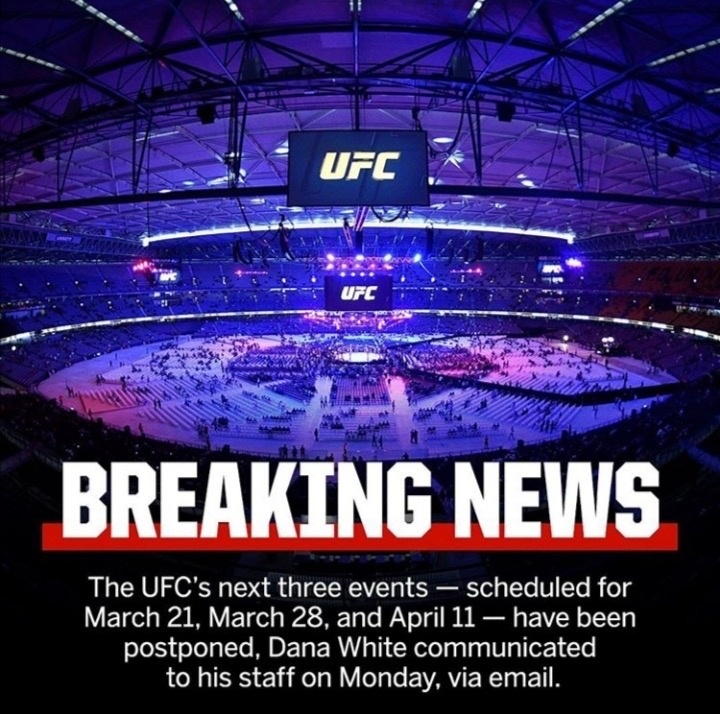Ближайшие три турнира UFC отложены, а именно UFC в Лондоне (должен был пройти 21-го марта) , Коламбусе (должен был пройти 28-го марта) и Портленде (должен был пройти 11 апреля) .