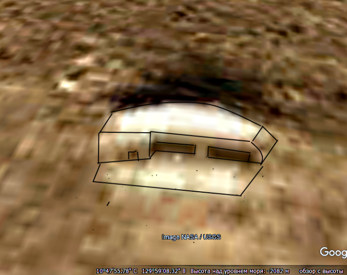 С помощью программы Google Earth в одной из пустынных областей марса удалось обнаружить сооружение напоминающее собой, укреплённый бункер. Его назначение остаётся неизвестным, но можно предположить, что он предназначен для транспортных целей. Об этом говорят его размеры. То, что он расположен в области, удалённой от других объектов которые во множестве разбросаны по всей поверхности планеты возможно показывает на то, что он был построен в ожидании катастрофы, которая случилась давным давно. Его хорошая сохранность и отсутствие воронок и метеоритных кратеров как раз и указывают на его целенаправленное строительство именно в районе, который по прогнозам обитателей Марса менее всего был бы подвержен разрушениям. На хорошую сохранность показывает отражающая способность поверхностей, которая хотя и частично разрушена, но мало подверглась эрозии. Ближайшие рукотворные объекты находятся на значительном удалении. То есть достижимость объекта могла быть достигнута только с помощью воздушных тр