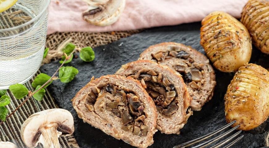 Рулет из фарша с грибами Фарш фаршируют грибами и запекают с желтым сыром. Вы можете подавать их на обед с картофелем и салатом или холодным для хлеба. Ингредиенты для 4 порции: Дополнительно: Алюминиевая фольга Способ приготовления: Булочку замочить в молоке. Лук очистить и нарезать кубиками. Грибы очистить и нарезать ломтиками. Одну часть лука обжарить на 2 столовых ложках масла вместе с грибами. (Вся вода должна испариться.) Приправить солью и перцем. Дайте постоять, чтобы остыл. Вторую часть лука обжарить на 2 столовых ложках масла. Обжаренный лук смешать с фаршем, выдавленным через пресс чесноком, яйцом, булочкой, солью, перцем и горчицей. Мясную массу выложить на алюминиевую фольгу, смазанную маслом. Ложкой (или руками) выкладываем мясо в прямоугольник толщиной 1,5-2 см. Выложить фарш из шампиньонов на мясо, оставив зазор от краев. Мясо свернуть в рулет. (Сверните вдоль длинной стороны вместе с фольгой и медленно оттяните ее назад и сверните дальше. Стороны рулета зажать). Го