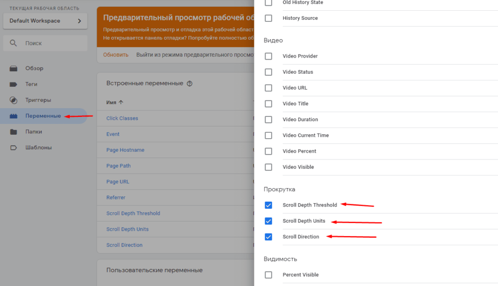Для этого переходим в GTM и в настройках переменных выбираем:
