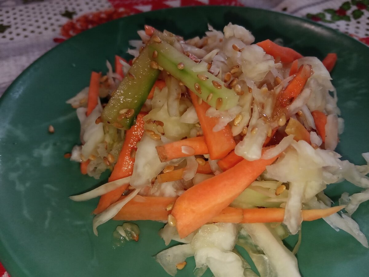 Здравствуйте дорогие мои друзья,подписчики,любители рецептов и кулинарии!Сегодняшний рецепт уникален по своей простоте и может использоваться как легкий овощной салатик,так и пикантная закусочка к шашлыку,плову и другим мясным блюдам. Итак,для начала тонко шинкуем морковку,либо пропускаем ее через терку для моркови по-корейски. Далее мелко рубим капусту,можно пекинскую и мнем ее руками. Затем соломкой нарезаем очищенный от шкуры огурец. Семена кунжута обжариваем на сковороде. Все хорошо перемешиваем и делаем заправку.Для этого смешиваем соевый соус с растительным маслом,добавляем сахар.Если вы будете делать закуску к мясу,то можно добавить лимонный сок или немного уксуса,так же уместно будет добавить красный перец. Приятного аппетита!