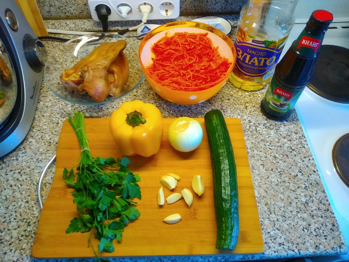 Для приготовления нам понадобится. Морковь: 500гр. Лук: 1шт. Свиные уши: 300гр. Огурец: 1шт. Болгарский перец: 1шт. Растительное масло: 150гр, Соевый соус: 30гр, Чеснок: 3 зубчика Соль, перец: по вкусу Овощи нарезаем соломкой Ушки тоже нарезаем солонкой Морковь натираем на крупной тёрке Мелко нарезаем чеснок и зелень К моркови добавляем нарезаны свиные уши Далее добавляем огурцы Болгарский перец Репчатый лук Последним кладём чеснок и приправы (вы можете использовать готовые приправы для корейской моркови, я использую соль, перец чёрный молотый, не много красного молотого перца, щепотку кориандра и 50гр. соевого соуса) Ставим на плиту посуду и начинаем разогревать в ней растительное масло ( я проверяю готовность масла опуская в него кусочек лука, если лук начинает жарится, значит масло разогрето до нужной температуры) Льём масло на овощи и аккуратно с помощью лопатки или ложки перемешиваем Даём салату настоятся и пропитаться приправами, достаточно пары часов чтобы салат дал сок. Я с