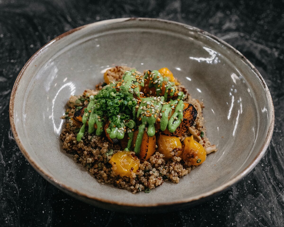 Постное меню: запечённая тыква, киноа, шимиджи, томаты черри, луковое песто