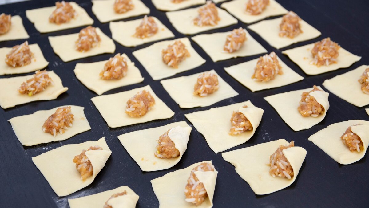 Начинаем формировать манты. 3 края теста сворачиваем к центру и закручиваем в рулет. Манты получается аккуратной, красивой формы и небольшие по размеру.