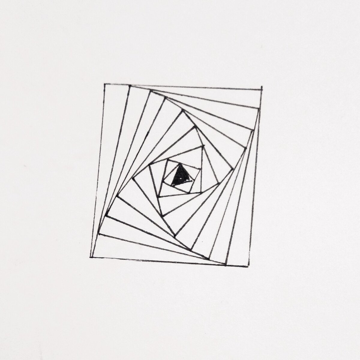 Если вы уже выполняли домашние задания с нами, возможно, помните, что найти все можно по тегу #рисуем просто дз Сегодня продолжим изучение тангла Paradox. Напомню, как он выглядит: Сегодня предлагаю потренироваться с треугольными танглами. Сначала необходимо нарисовать два равносторонних треугольника размером 9х9 сантиметров и разделить на четыре равные области каждый. Вот так: Расскажу один из вариантов построения заготовки. Рисуем горизонтальный отрезок длиной 9 сантиметров. Отмечаем середину. Из середины ведём вверх луч, перпендикулярный нашему отрезку. Теперь от одного конца горизонтального отрезка проводим отрезок, который тоже равен 9 сантиметрам и заканчивается на луче, идущем из центра первого отрезка. У нас получилось уже две стороны. Осталось лишь соединить их между собой третьим отрезком, который тоже образует сторону длиной 9 сантиметров. Равносторонний треугольник со стороной 9 сантиметров готов. Середина на одной из его сторон отмечена. Отметим середины и на двух других