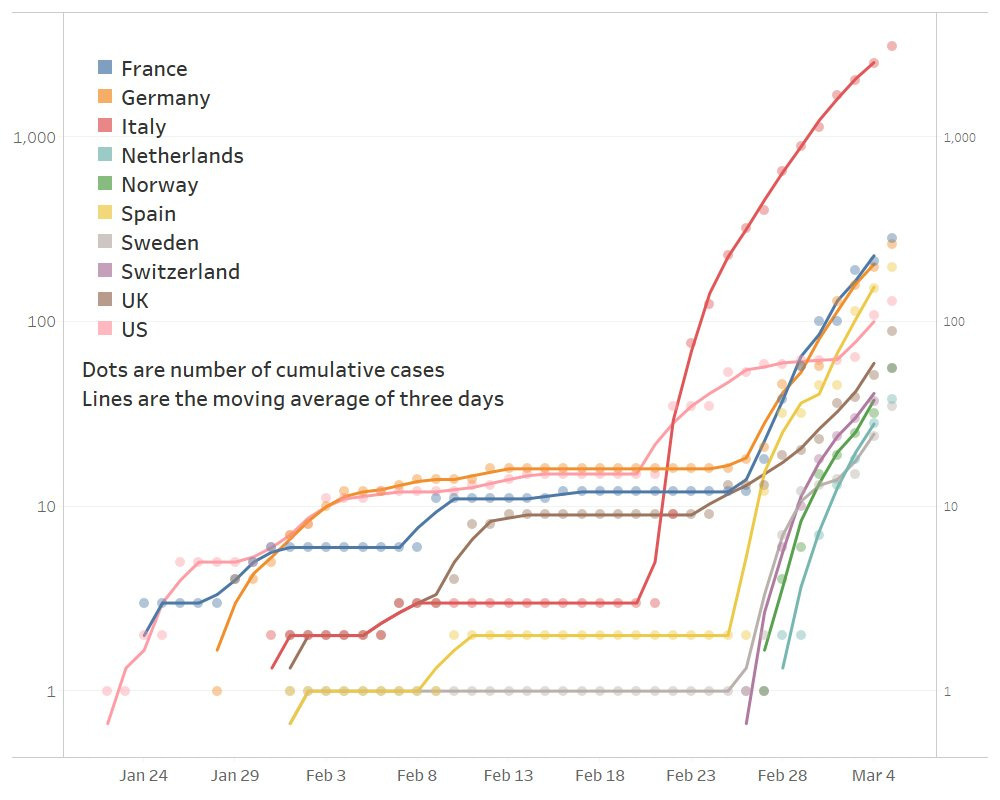 Почему лучше ранняя паника. Допустим, что риск погибнуть от коронавируса все еще невелик, и больше шансов быть сбитым машиной. Но! Если я ничего не буду делать по отношению этого риска, я помогу короновирусу распространяться. И в результате этого кто-то обязательно умрет. Вот почему сейчас нужно масштабировать панику, а не рациональность. Паранойя из-за короновируса может быть крайне полезной, поскольку она является одним из важнейших факторов смены тренда в распространении коронавируса. Этот фактор – единственный способный распространяться более вирусно, чем сам коронавирус. Если информация об этом будет распространяться и доходить до сознания людей быстрее коронавируса, эпидемия остановится. Источник: https://www.youtube.com/watch?v=e2Kga5HeAqk Возможно уже поздно ? Насколько все серьезно, видно из приложенного графика. ВОЗ рекомендует странам активировать наивысший уровень национальных протоколов управления реагированием. «... уроки не были извлечены». «Вспышка в северной Италии,