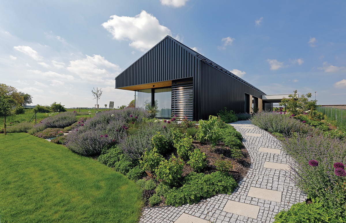 С самого начала весь дизайн был спроектирован, как дом для двух человек, дети которых уже стали взрослыми. Это отличает дом от других проектов авторов: в нём нет детских комнат, но он предназначен для простого и комфортного проживания. Как место встречи для детей и их семей… Наиболее отличительным элементом дома является масса с асимметричной двускатной крышей, которая облицована черным листовым металлом. Он основан на базовой морфологии сельского сарая, только его слегка асимметричная крыша перемещает дом к современной архитектуре. Гостиная прикреплена к основной массе и образует Т-образную композицию плана, которая является противовесом чёрному веществу. Сочетание массивного черного блока с лёгкой, нематериальной и остекленной частью придаёт дому динамичное и аутентичное выражение. Внешний вид сада буквально врастает в гостиную, обеспечивая владельцам достаточную приватность. Чтобы максимально защитить эту частную часть от окружающей среды, часть жилой комнаты со стороны улицы защищ