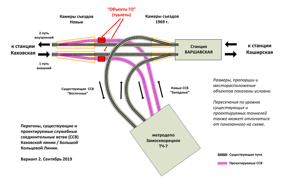 По первому проекту, прошедшего Публичные Слушания, тоннель одной ССВ прокладывался МЕЖДУ существующими перегонными тоннелями (Рис 1). По новому проекту тоннели двух ССВ соединяются с существующими перегонными тоннелями, подходя к ним СНАРУЖИ, т.е. ближе к жилым домам (Рис 2).