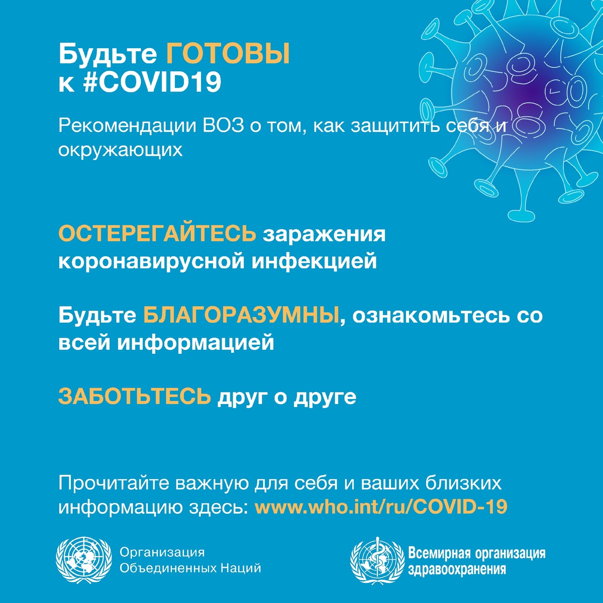 Следите за новейшей информацией о вспышке COVID-19, которую можно найти на веб-сайте ВОЗ, а также получить от органов общественного здравоохранения вашей страны и населенного пункта. Наибольшее число случаев COVID-19 по-прежнему выявлено в Китае, тогда как в других странах отмечаются вспышки локального характера. В большинстве случаев заболевание характеризуется легким течением и заканчивается выздоровлением, хотя встречаются осложнения. Защитить свое здоровье и здоровье окружающих можно, соблюдая следующие правила: