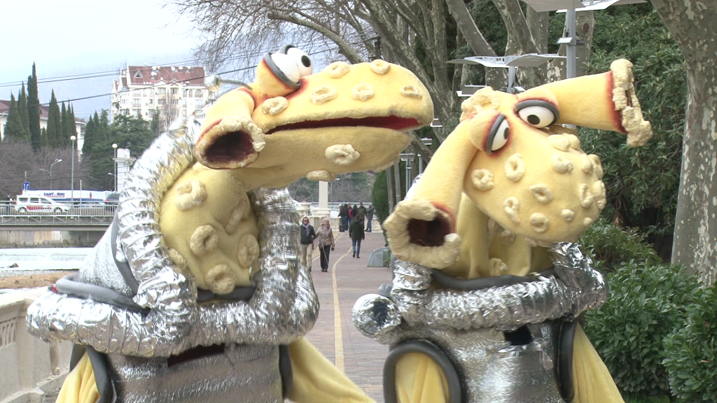От коронавируса Сочи спасут инопланетяне – таков сценарий фильма, который сейчас снимают на курорте. Блокбастера, конечно, ожидать не стоит, да и съемки проходят не по канонам кинематографа. Авторами корометражки стал коллектив городского театра кукол «Саквояж». «Будьте здоровы! Все пройдет и это тоже», – такова основная идея фильма, сценарий которого был написан буквально за полчаса. Главные герои — инопланетяне. Куклы были сшиты актерами сочинского коллектива «Саквояж» несколько лет назад. Их зовут Луняшки, они хорошо известны сочинской публике и не раз прилетали в Сочи на праздники. На этот раз причиной их визита стал коронавирус. Роман Соколовский, руководитель театра кукол «Саквояж»: «Мы очень расстроены, потому что мероприятия все отменены и наши спектакли тоже отменены. И совпала эта отмена с нашим праздником профессиональным – с Международным днем кукольника, который мы каждый год отмечаем премьерой. И мы готовили премьеру спектакля к этому празднику, но, к сожалению, так пол