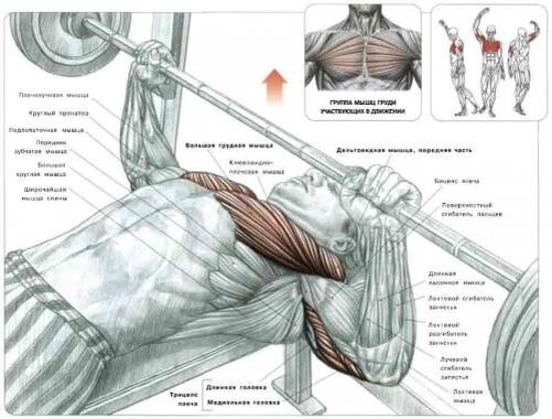 На иллюстрации сверху представлена схема выполнения жима штанги лежа и показаны какие мышцы принимают участие в работе:
