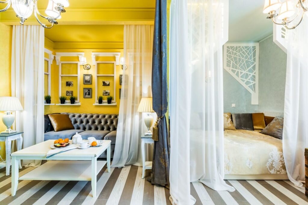 Гостиная. Лучше использовать легкие ткани, чтобы зрительно не уменьшать комнату. Для отдаленных уголков стоит продумать дополнительные источники света. Разделение возможно тремя способами: