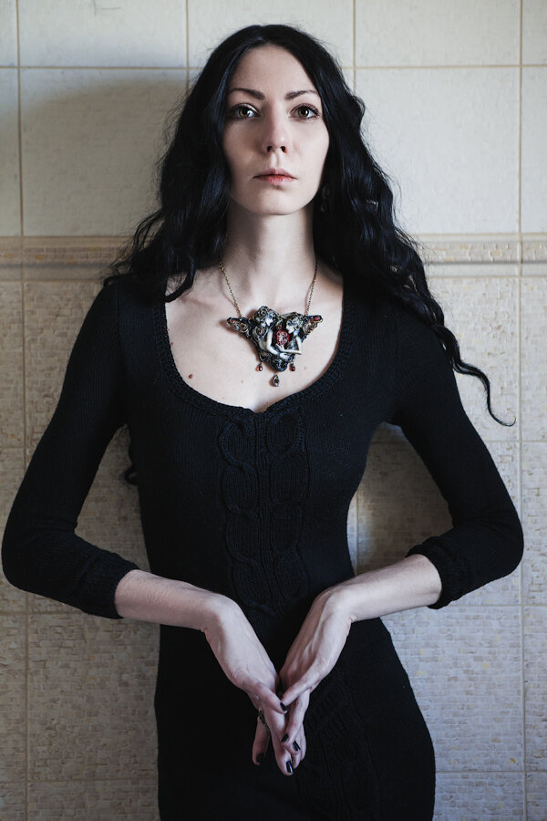 На фото - моя чудесная модель, которая на самом деле волшебница. Это Лера Прокопец, художник, создатель удивительной Мастерскаой «Гримуар Чёрной курочки». Украшения на ее груди - это ее «картины». Цитата со страницы ее мастерской: «Наши работы - небольшие, но ёмкие истории из сфер мифологии, фольклора и культурных символов разных эпох и народов, которые побуждают задуматься над нашим собственным местом в мире реального и иллюзорного, над дуализмом привычных явлений и чувств, и обнаружить красоту и смысл в зыбкой, но прекрасной Жизни.»