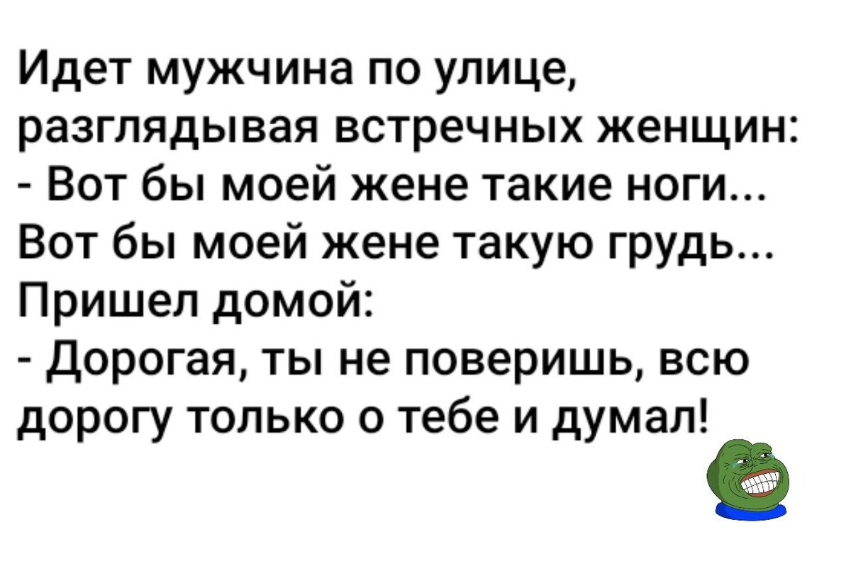 *** В автобусе едет женщина с детским горшком в одной руке и пакетами в другой. Подходит к выходу, тычет горшком впереди стоящего мужчину и говорит: - Мужчина, вы не сходите? Тот опускает голову, видит горшок и говорит: - Нет, я до дома потерплю... 😂 *** Мужик хочет заселиться в гостиницуюе, а ему и говорят: - Мест нет! Есть одно, но там сосед храпит так что всю ночь спать не будете! Мужик говорит: - Нифига! Пойдет! На следующее утро мужика спрашивают: - Ну как спали? - Нормально! - ? - А я к нему вечером подошел и сказал: "Спокойной ночи! Милый!", и поцеловал. Так он после этого, не только не храпел - всю ночь глаз не сомкнул. 😂 Спасибо, за то, что читаете.😋 Поддержите лайком 👍🏻