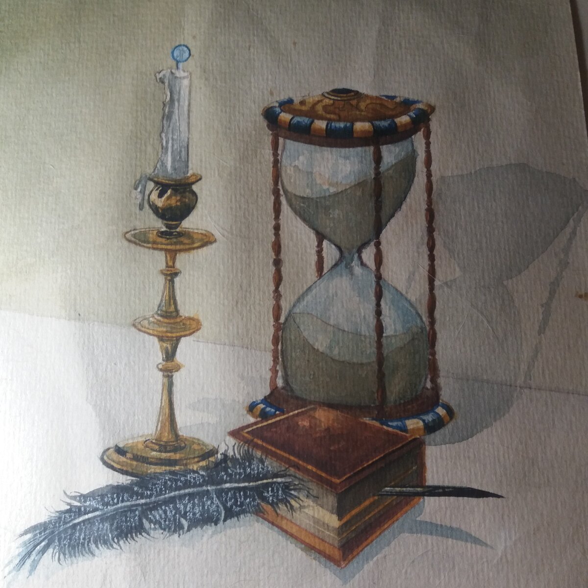Это была небольшая акварель в тонкой деревянной рамке, под стеклом. И изображала несколько предметов, в восточном стиле, - песочные часы, подсвечник, перо и книгу.