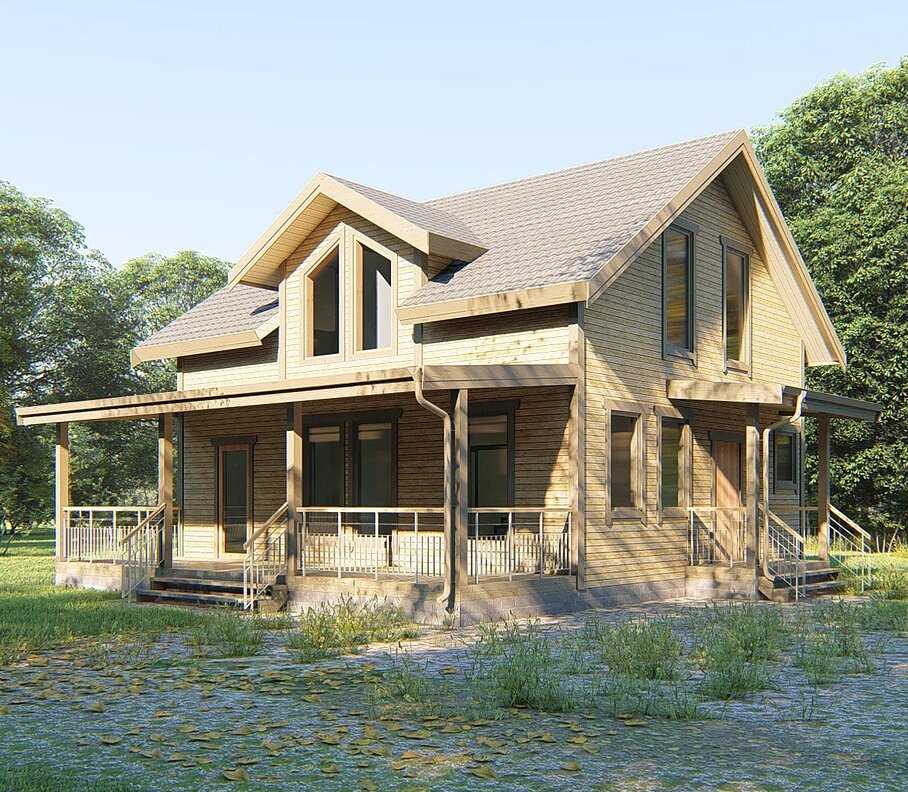 Параметры дома Габариты дома 8х9,2 м. + терраса 2,6х9,2 м. Общая площадь 152 кв.м. Площадь застройки 103 кв.м. Высота 1 этажа по каркасу 2,7 м. Высота 2 этажа по каркасу 1,2-3,8 м. Описание Это каркасный дом с мансардой и большой крытой террасой площадью 24 кв.м. На первом этаже дома располагается гостевая спальня, площадью 11 кв.м., холл, большая объединённая кухня-гостиная 34 кв.м., и санузел. На втором этаже расположены 2 просторных спальни и санузел. Фундамент дома выполнен из винтовых свай диаметром 108 мм. с наваренными оголовками 200х200 мм. Сверху, на оголовки устанавливается деревянный ростверк в виде составных балок собранных из доски 50х200 мм. Цокольное перекрытие собирается из доски 50х200 мм., с утеплением до 200 мм между балок перекрытия. Междуэтажное перекрытие так же выполнено из доски 50х200 мм., но в отличии от цокольного имеет в 2 раза меньший шаг раскладки балок. Наружные стены собираются из доски 50х150. В качестве способа обеспечения жёсткости стен, предус
