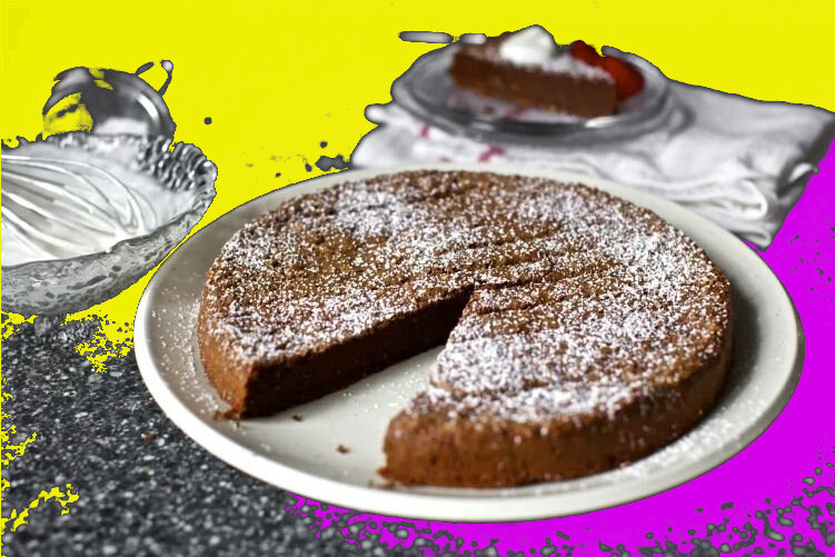 Сахарная пудра, взбитые сливки и / или ягоды для подачи (по желанию) Приступим Разогрейте духовку до 180°C. Смажьте маслом форму для пирога и выстелите дно кружком пергаментной бумаги. Растопите сливочное масло и шоколад вместе на паровой бане (жаростойкая миска, лежащая на кастрюле с слегка кипящей водой) или короткими вспышками в микроволновой печи, часто помешивая. Отложить в сторону. В миске взбейте яйца и сахар с солью до удвоения в объеме. Это займет от 5 до 9 минут, и я реком