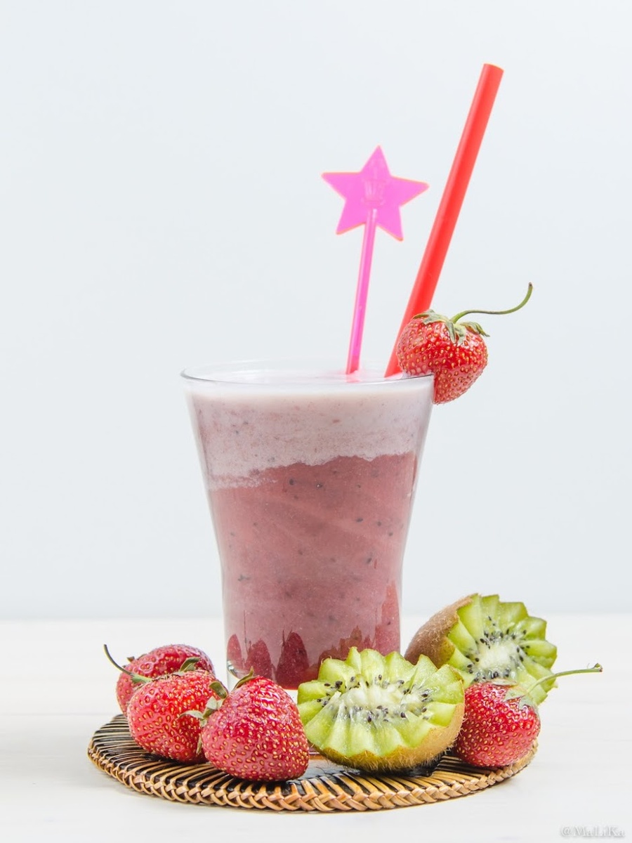 Смузи с клубникой, бананом и киви я готовлю двумя способами: сразу смешиваю в блендере все ингредиенты или сначала делаю фруктово-ягодное пюре, потом молочно-банановое. И смешиваю в стакане. Оба варианта вкусные, а второй еще и красивый. Если ложкой помешать по спирали напиток, то оба слоя красиво начнут смешиваться. * клубника — 100 г; * банан — 1 шт.; * киви — 1–2 шт.; * кефир или йогурт (по вкусу) — 350–450 мл. 1. Очистите банан и киви от кожуры. 2. В блендере соедините клубнику и киви, во второй чаше - молоко или йогурт с бананом. 3. Взбейте ингредиенты до однородной консистенции. 4. Разлейте смузи по стаканам, чередуя слои ягодного и молочного напитка, и подавайте сразу после приготовления. Приятного аппетита!
