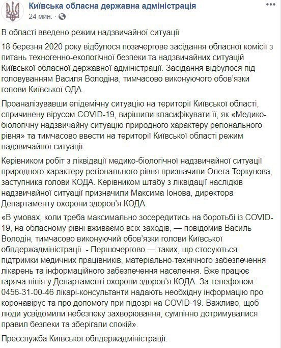 Такое решение было принято на заседании областной комиссии по вопросам техногенно-экологической безопасности и ЧС сегодня, 18 марта. Предлогом такого решения (конечно же) послужило распространение COVID-19 (коронавирус в народе) Решение вроде и правильно, только вот вопрос "эпидемическая ситуация" это 1 подтвержденное заражение? Т.к. в киевской области все 1 официально зараженный. «Проанализировав эпидемическую ситуацию на территории Киевской области, вызванную вирусом COVID-19 мы решили классифицировать ее как «Медико-биологическую ЧС природного характера регионального уровня». И временно ввести на территории Киевской области режим чрезвычайной ситуации» было отмечено на заседании. PS Ниже скрин официального заявления со странице в Facebook Киевского облдер. администрации