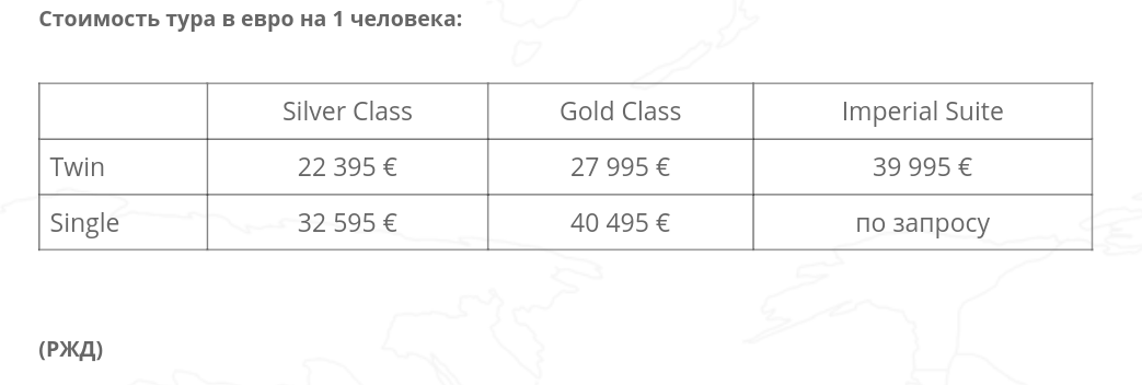 Москва - Пекин Приобрести билет на такой рейс стоит 1, 5 млн. рублей в 2-ух местном купе, а если вы хотите ехать одни, то все 2,8 млн. рублей. Это не выдуманные цифры, а реальные цены на сайте РЖД, цены на мой взгляд указаны в евро, так как ни один россиянин не будет платить такие деньги за поезд, который отправляется всего пару раз в год из Москвы в Пекин. С виду - самый обычный вагон, но ведь конфету по обертке не судят, не так ли? Комнаты отдыха, спортзалы, няни, полы с подогревом, ретро интерьер и индивидуальный подход к каждому - это лишь половина того, что присутствует в поезде. На протяжении всего состава можно увидеть четыре спец. вагона, первый - кухня, второй - бар, третий - полностью для обслуживающего персонала, а последний - место, куда вы сможете уместить весь свой багаж. Из Москвы в Пекин поезд будет ехать около 18 дней, но есть и другой маршрут, Москва - Владивосток, там путешествие займёт порядка 15 дней, а цена будет составлять около 1,2 млн. рублей. Вагоны зде