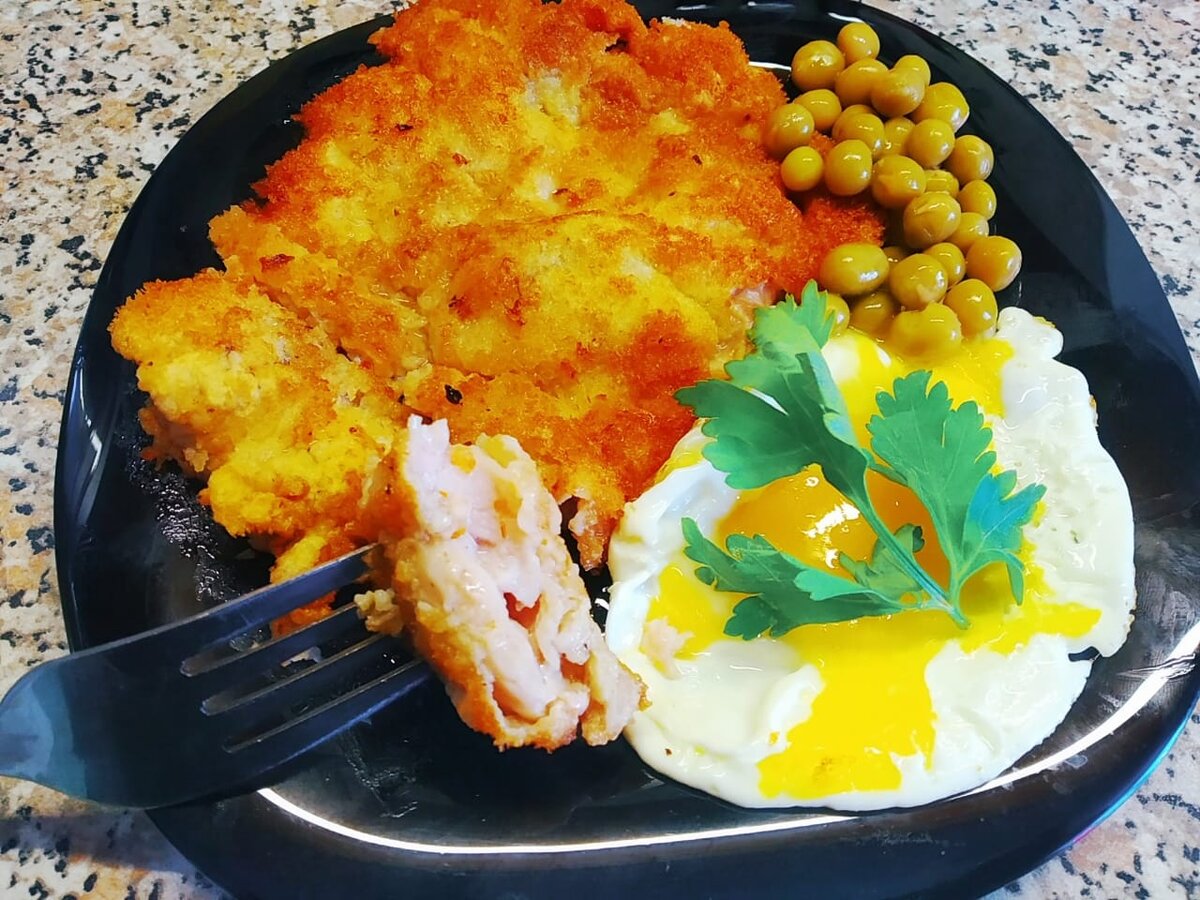 Для приготовления нам потребуется. Окорочок куриный: 6 средних окорочков Мука: 150гр. Сухари панировочные: 150гр. Яйца: 4шт. Масло растительное: 20гр. Для начала вырезаем кость с окорочков Посыпаем соль, молотым чёрным перцем и приправой для курицы Накрываем курицу полиэтиленовым пакетом или пищевой плёнкой, что бы не пачкать кухню) Отбиваем Панируем с начало в муке, потом в яйце и в панировочных сухарях Далее кладём на разогретую сковороду Обжариваем с двух сторон Можно накрыть мясо крышкой и дать ему слегка пропариться, тогда по готовности мясо не будет сырым. Украшаем пожеланию и подаём с гарниром к столу. ПРИЯТНОГО АППЕТИТА!!! И не забываете подписаться что бы не пропустить новых рецептов))))