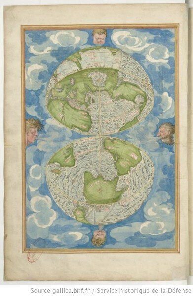 Обратите внимание на наличие, в нижней части мира мифического южного континента, как предполагалось, чтобы сбалансировать земельные массы в северном полушарии.