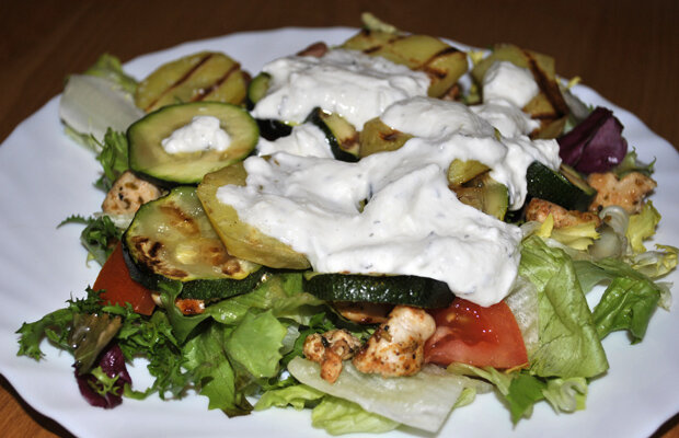 Рецепт вкусного салата с куриной грудкой, салатным миксом и овощами гриль с йогуртовым соусом. Ингредиенты: микс салатов