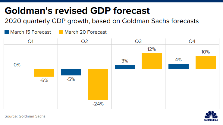 Неопределенность ведет к разбросу оценок в масштабах падения. Например, Goldman Sachs ждет снижения ВВП США во втором квартале на 24% в годовом выражении. Еще 5 марта оценка падения была на уровне 5%.