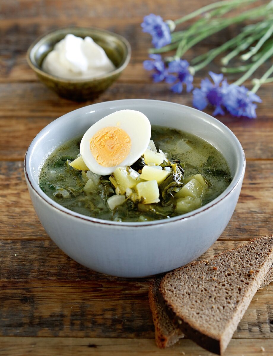Состав блюда: 300г капусты белокочанной ¹/2 буханки ржаного хлеба 1л мясного бульона 2 моркови 3 клубня картофеля 2 стебля лука-порея 1 луковица 2 яйца 2 ст. л. жира, зелёный лук, лавровый лист, перец чёрный молотый, соль. Как готовить: 1. Картофель и морковь вымыть, очистить, нарезать кубиками. 2. Лук репчатый очистить, вымыть и нарезать полукольцами. Лука-порей вымыть и нарезать колечками. Лук зелёный вымыть и нарубить. 3. Репчатый лук и морковь выложить на сковородку с разогретым маслом, жарить в течение 3 минут на сильном огне, затем влить немного воды и тушить 3-5 минут. 4. Хлеб нарезать маленькими ломтиками и подсушить в духовке. 5. Капусту вымыть и нашинковать. Бульон довести до кипения, положить капусту. 6. Варить в течение 10 минут, добавить картофель, тушёные морковь и репчатый лук, варить 10 минут, положить лука-порей, посолить, поперчить, варить на слабом огне 5-7 минут, посыпать зелёным луком. 7. Яйца сварить в крутую, остудить, очистить и разрезать вдоль пополам. 8. В гот