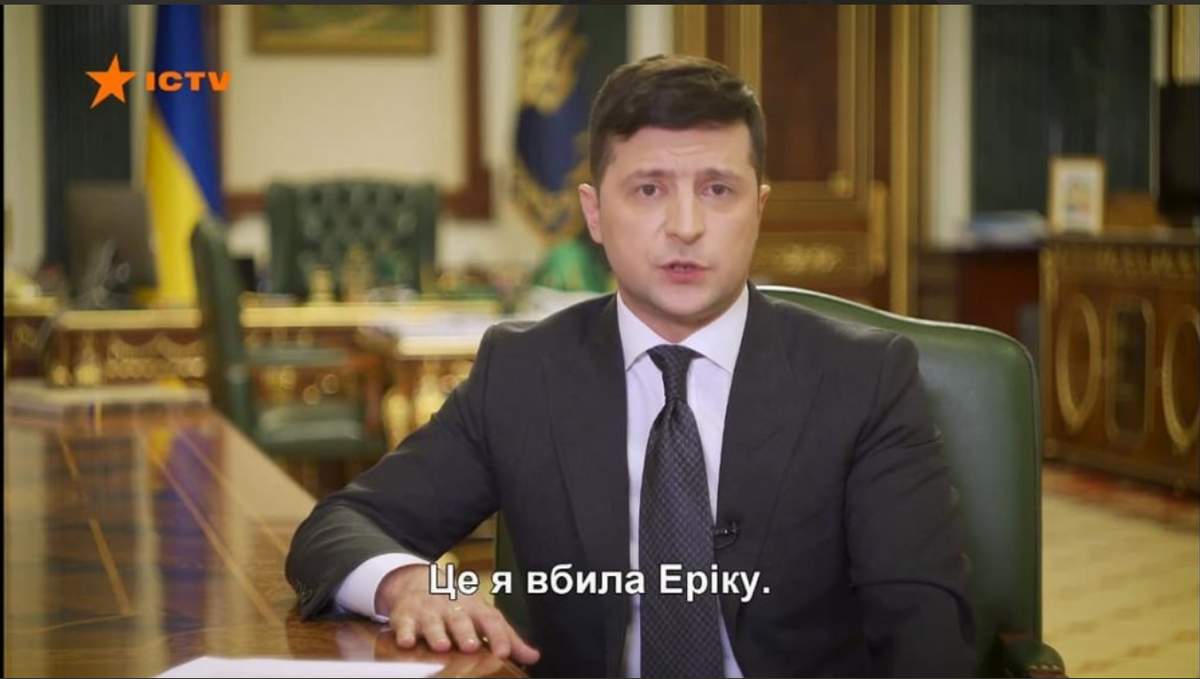 Вечером 17 марта президент Украины Владимир Зеленский опубликовал очередной обращение к гражданам. Украинский телеканал ICTV оконфузился с обращением, пустив под речью президента необычные субтитры (чтобы посмотреть видео, проскрольте материал до самого низа). Что случилось? Зеленский ежедневно записывает видеообращения к гражданам, чтобы держать в курсе о ситуации с коронавирусом в Украине. На этот раз он посвятил свое обращение эвакуации украинцев из других стран. Однако у телеканала ICTV возникли трудности при трансляции. Телеканал ошибочно сопровождал его речь титрами одного из фильмов. К концу обращения, судя по видео, ошибку все же исправили. "Это я убила Эрику", "Она забрала у меня любимого человека", "Простите меня, если сможете", "Кристиан, принеси лестницу!", — писали в субтитрах под речью Зеленского. Реакция сети Такой конфуз стал главным хитом и темой для бесконечных приколов в Twitter, Facebook и Телеграм. Что за Эрика? Оказалось, что субтитры были от русскоязычного дет