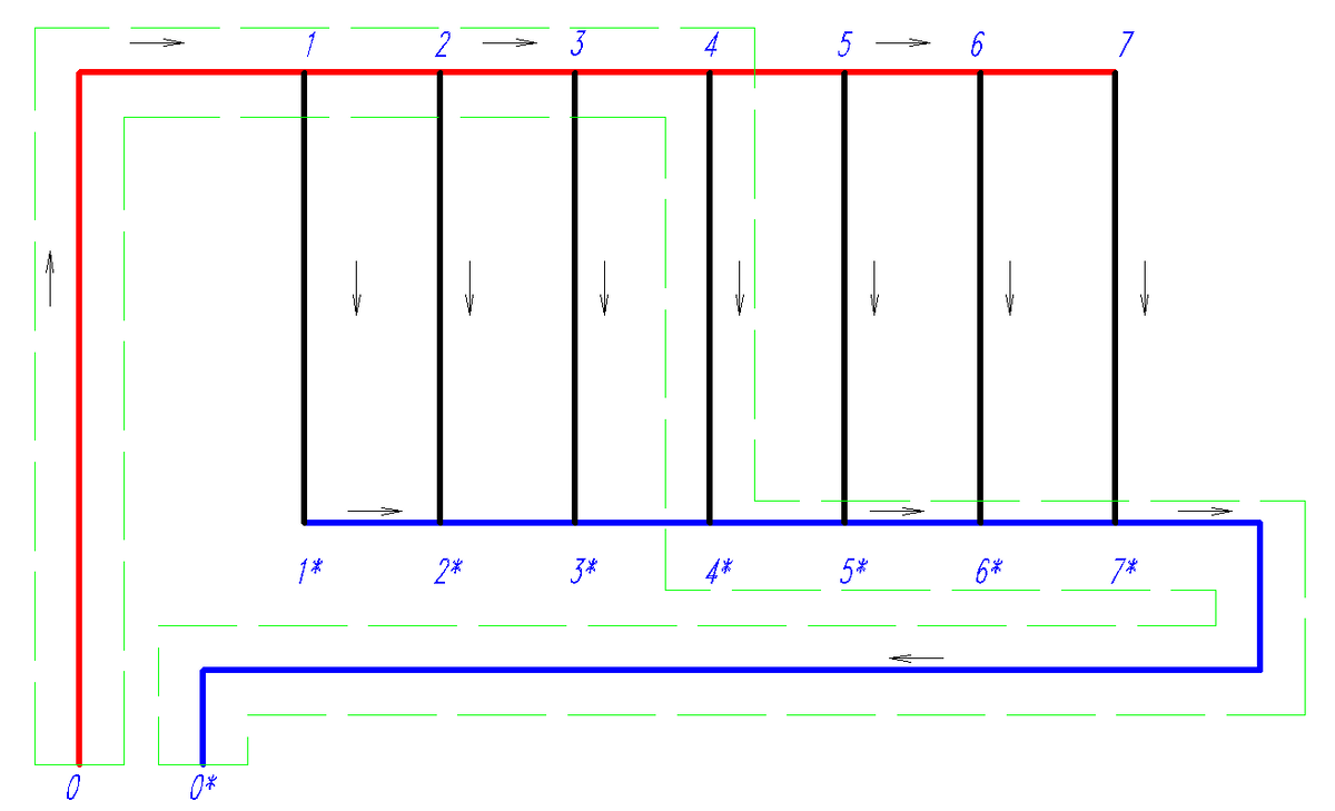 Статья предназначена для специалистов, работающих в сфере ТГВ, в частности для проектировщиков. Во многих справочниках момент гидравлической увязки (невязки) часто описывается вскользь для тупиковой системы, а про попутную систему информации практически нет. Поэтому на простом примере разберем это процесс. Для начала, рекомендую прочитать аналогичную статью про тупиковую систему отопления. Итак, на скриншоте, для примера, представлена попутная система отопления с семью стояками. Гидравлический расчет начинают с поиска самого нагруженного кольца. В попутной системе это обычно это центральный стояк (НО НЕ ВСЕГДА!!!). В сомнительных ситуациях, необходимо просчитывать все эти непонятные варианты. А лучше просчитать полностью ВСЮ систему, со всеми ответвлениями. Времени это занимает немного, для меня, оптимальный алгоритм расчета я описывал ранее тут. Причем, в расчете наглядно будет видно, насколько необходимо изменить сопротивление участка, чтобы сравнять сопротивления всех колец,