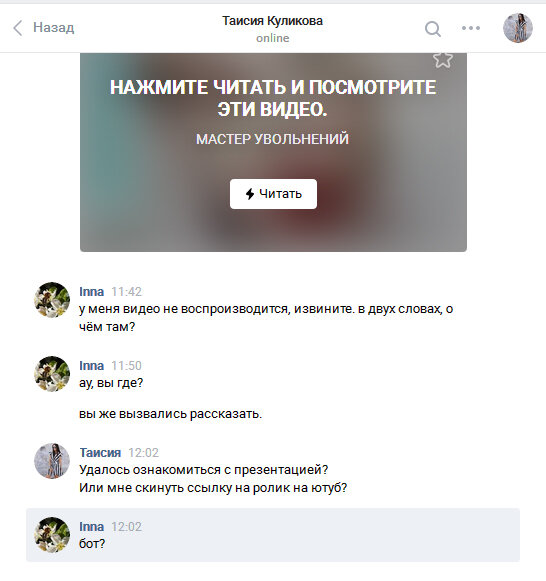 Но начнём мы не с этого, просто на одном примере расскажу вам, как вас буквально заставят перейти по ссылке или посмотреть ролик, но котором крутится какая-то реклама. Первым делом вам предложат вступить в паблик. Неважно, какой он тематики, главное, чтобы вы в него вступили. После сего действа к вам в ПМ (приват мессейдж, по русски это ЛС - личные сообщения) скромно так кто-нибудь постучит и предложит рассказать о сообществе, а потом и подсунет вам ролик с рекламой. Если вы на это не поведётесь, то вам предложат ролик на ютубе. На этом всё, в данный момент вы им больше не нужны, рекламу вы посмотрели, сидите ровно и ждите, когда вы снова потребуетесь.