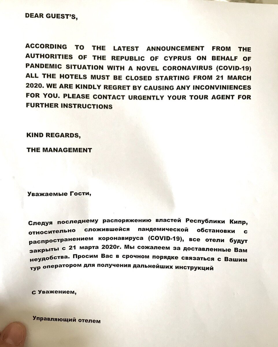 Вот так уж нам повезло или не повезло, что мы с детьми оказались на Кипре. То ли попали в передрягу, да и пропавшей половины путевки жаль, то ли радоваться, что успели в последний вагон сесть. Прилетели мы с детьми 13 марта, а 15 марта Кипр закрыли и отменили все рейсы и туры.. Наша путевка была до 27 марта, но все отели закрываются (в частности в нашем еще позавчера клиринг оставил вот такое объявление). Те, кто приехал до 17 в наш отель - улетели 16. У нас пропадает неделя, а нашим соседям повезло ещё меньше - у них был тур до середины апреля. Из нашего отеля последние гости иностранцы улетают 22, с 23 марта весь персонал отправляется в отпуск. Уже сейчас на улицах много подобных объявлений, многие кафе и магазины закрыты. Макдональдс работает, но только на вынос. На улицах за последние 2 дня резко сократилось количество местных, и доля машин с красными номерами (а значит арендованных)-стала больше. Многие ходят в масках, многие водители в масках и обязательно все продавцы.