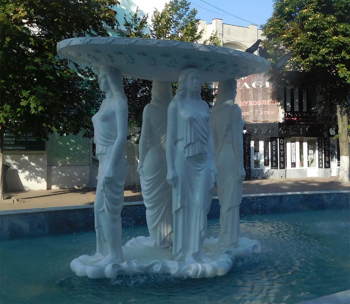 В Ейске есть чудесный фонтан в центре пешеходной улицы. Четыре девушки кариатиды удерживают чашу, в которой купаются голуби. Кариатиды белого цвета, жаль, что не золотые. Уникальность фонтана в том, что кариатид четыре, одну можно забрать на время отдыха у Азовского моря, чашу удержат и три кариатиды. Обычно, делают скульптуры трёх граций, прошлого, настоящего и будущего. Фонтан заставляет задуматься, вы как организовали свою жизнь, можете ли свободно отправиться путешествовать или без вас всё «развалится», всё завязано на вас? Если завязано на вас, то даёте ли вы свободу другим самим решать свои проблемы, или опекаете их как маленьких? Не давая места для духовного роста и самостоятельности? Короче много вопросов, лучше пойти купаться в Азовское море, но в Ейске в море много водорослей, в тридцати километрах есть уникальная Должанская гряда, на машине лучше поехать тута, там чистое море и ракушечный пляж.