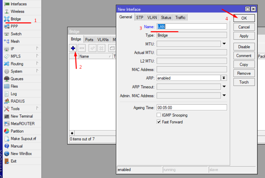 Объединение портов в Bridge. Объединим локальные интерфейсы в группу коммутации, для этого нам нужно будет создать мост, переходим в раздел “Bridge ” и создаем сетевой мост с названием “LAN ” . Затем переходим на закладку “Bridge - Ports” и последовательно добавляем в мост интерфейсы локальной сети “ether2-etherN” в зависимости от количества интерфейсов, также добавляем интерфейс при наличии wlan (W-Fi).